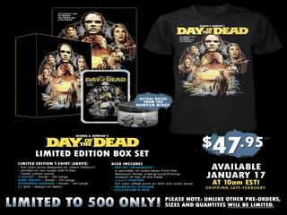 Momci iz "Fright Rags"-a (firma koja se bavi proizvodnjom i prodajom kvalitetnih majici sa horor i znanstveno fantastičnom temom) su od 17. siječnja ove godine izbacili ograničeno izdanje majice Romerovog "Day of the Dead" i to u Box Set izdanju (lijepo dizajnirana majica autora Justina Osbourna, kolor poster dimenzija 27,9 x 43,2 cm, posebna naljepnica i kutija puna kamenja sa seta gdje je Romero snimio većinu svog filma), koji dolazi u fino pakiranoj kolekcionarskoj kutiji a sve po cijeni od 47, 95$ (+ 9.70$ koliko dođe poštarina za građane RH). Akcija traje sve do 27-tog ovog mjeseca.